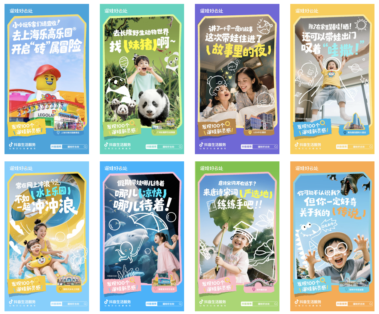 项目启动阶段,抖音生活服务「遛娃好去处」深度合作国民动漫IP奶龙,通过亲切可爱的视觉符号与亲子家庭建立情感连接,随后推出的系列海报,以小朋友的沉浸式视角呈现上海乐高乐园、长隆野生动物世界、LIZA中古酒店、青岛健信国际大酒店、国色天乡水上乐园、扬州瘦西湖、常州中华恐龙园、海南海洋欢乐世界八大重点商家,将站内亲子用户经常问的「去哪儿遛娃?」具象化为一个个生动可感的灵感目的地。