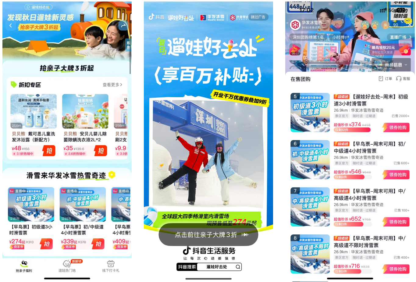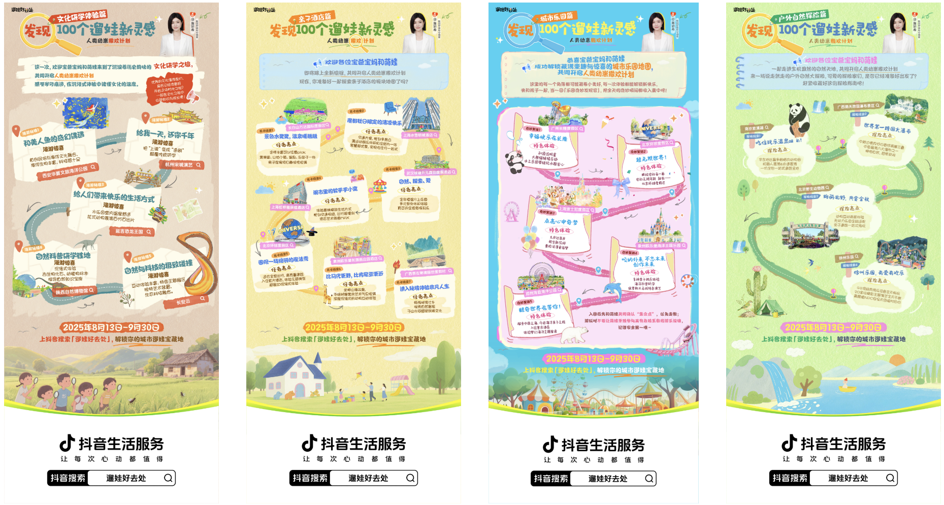 2025年8月-10月,抖音生活服务发起「遛娃好去处」活动,以「自然户外、乐园、人文、亲子酒店」四大场景为核心,通过“发现100个遛娃新灵感”为主线,整合IP联动、明星资源、线下事件与区域化内容深耕,助力商家构建从内容种草到体验转化的完整链路,实现品牌曝光、客群拓展与生意增长的多元目标。