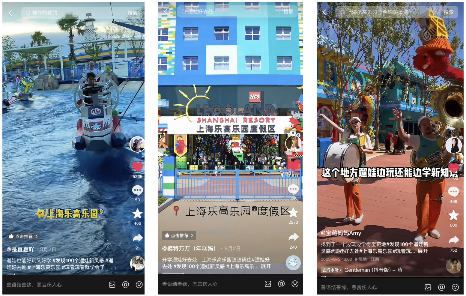 为了给消费者提供清晰的打卡路径促进客单转化,抖音生活服务「遛娃好去处」配套大连锦辉商圈、上海乐高乐园度假区、广州长隆野生动物园线下互动装置打卡点,发布清晰标注位置与游玩动线的点位攻略图,大幅提升了亲子家庭的参与便利性。「在大连发现奶龙世界」、「在上海发现拼搭世界」、「在广州发现清凉活力」等新奇冒险体验为亲子家庭创造了独特的游玩记忆,更激发了用户在社交平台的分享、传播欲。