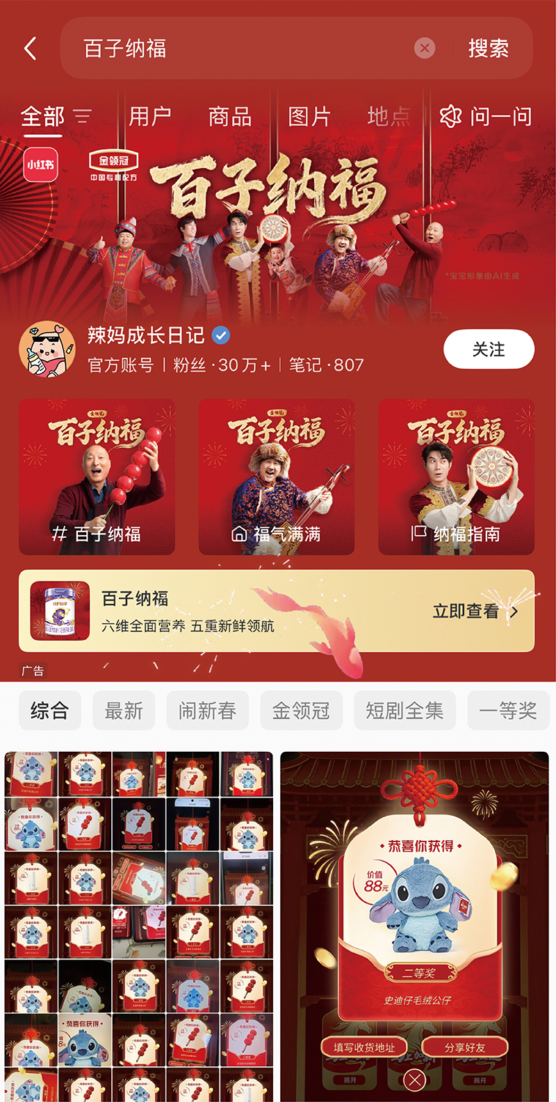 而活动期间产生的大量UGC笔记,则沉淀为品牌可长期复用的内容资产。春节过后,当用户再搜索“金领冠珍护铂萃”“宝宝奶粉”等相关关键词时,这些真实、温暖的内容依然会出现在搜索结果中,持续影响后续用户的消费决策。