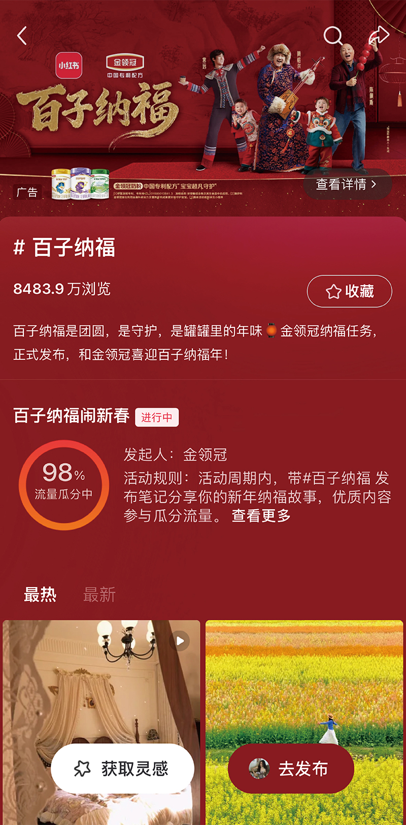 产品力足够硬核,品牌沟通便有了向上生长的空间。2025年春节,金领冠以“百子闹春”IP初试啼声,在母婴赛道留下印记。今年春节期间,金领冠延续“百子”IP的叙事脉络,与小红书深度共创,将“百子纳福”打造为一场有文化质感、有情感共鸣的春节叙事。从去年的“闹春”到今年的“纳福”,品牌完成了一次关键跃迁:不再只是呈现节日的热闹表象,而是真正走进新生代父母的内心,与他们探讨“陪伴”与“成长”的本质。
